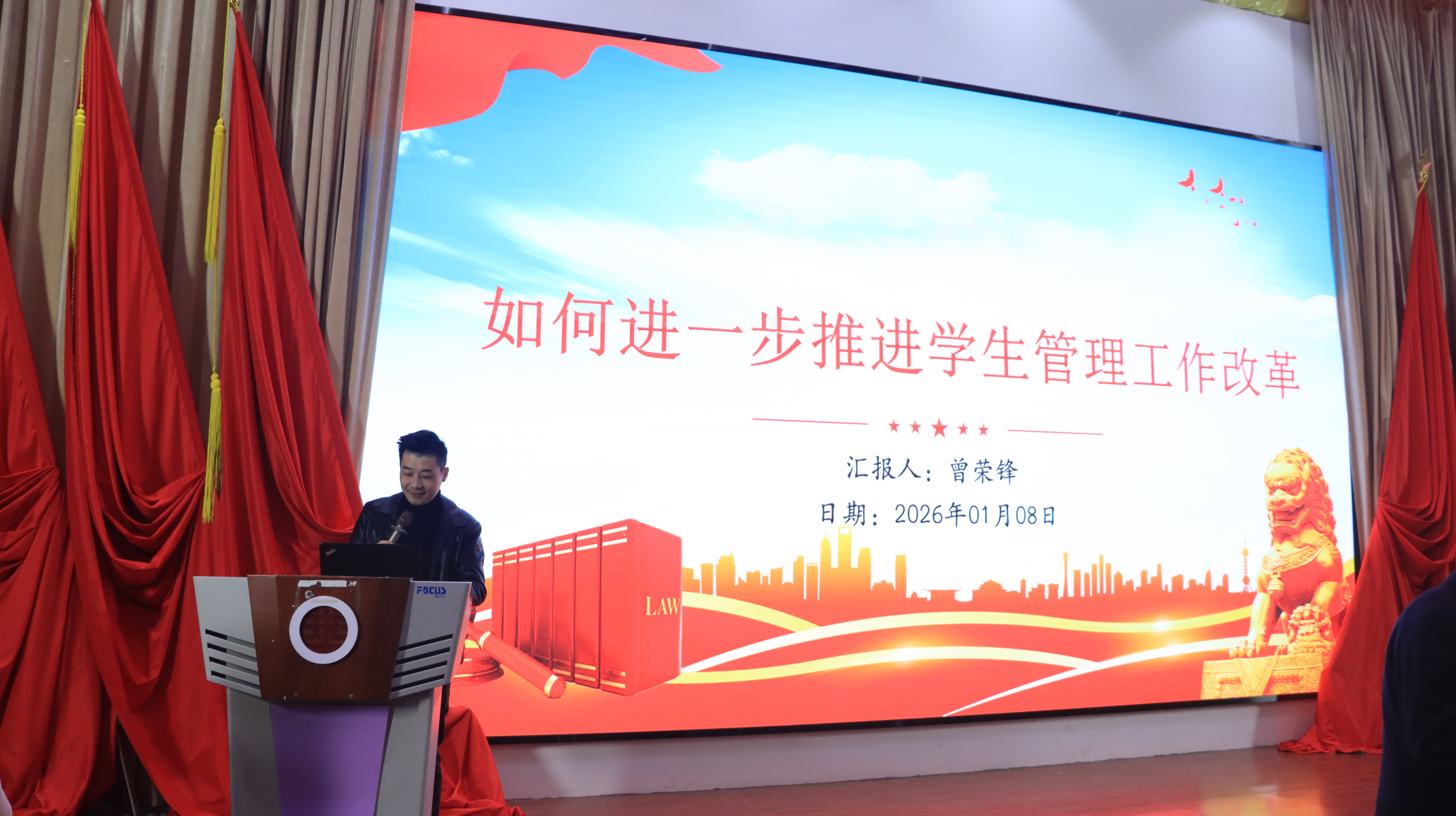 随后,学生处副处长曾荣锋作《广东华夏高级技工学校学生管理工作改革汇报》,围绕七大关键议题展开详细阐述。他首先强调“思想统一、明确改革目标”的重要性,提出学生管理改革需以培养高素质技能人才为核心导向;在“学生违纪处理”方面,结合具体案例讲解了违纪处理的流程规范与教育转化机制,强调“严管与厚爱结合”;针对“准军事化宿舍内务卫生管理”“学生夜间手机管控”“早操、早升旗管理、晚自习管理”三大日常管理重点,提出了标准化管理方案与执行细则,明确各环节责任分工;最后,围绕 “德育管理队伍建设”,从人员选拔、专业培训、考核激励等方面提出系统性建设思路,为提升学生管理队伍专业素养提供了具体指引。