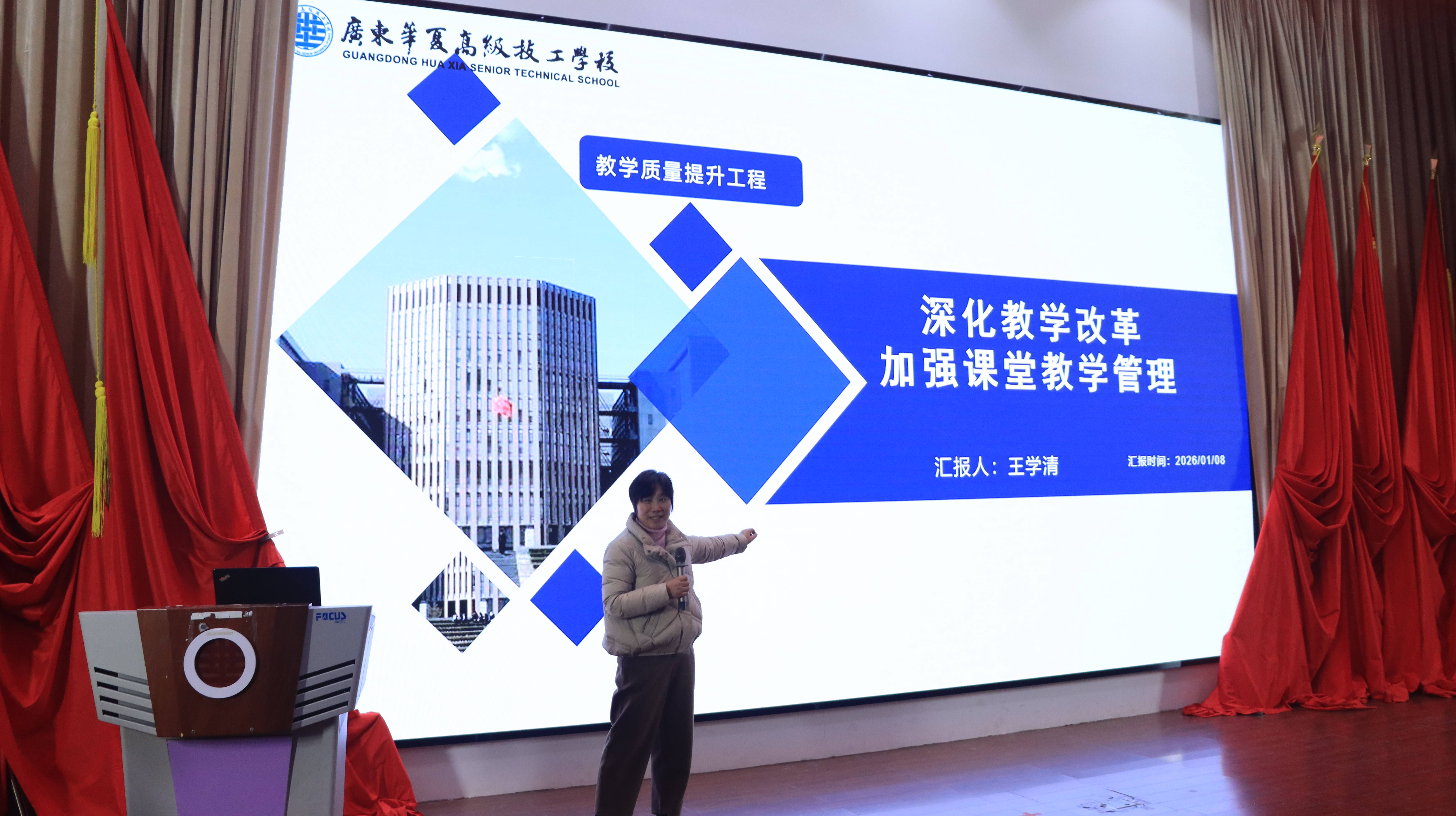 最后,教务处处长王学清以《深化教学改革,加强课堂教学管理》为题作汇报,聚焦教学工作全流程优化。她先对2025年教学工作进行全面回顾,系统总结了年度教学工作取得的成绩与存在的主要问题,让干部们清晰把握教学工作现状;随后详细阐述了2026年深化教学改革思路,提出以产教融合为主线,推进专业设置优化、课程体系重构、师资队伍建设、教学模式创新、实训条件升级、评价机制改革、校企合作深化七大改革举措落地实施;在“提升课堂教学管理水平”部分,分享了课堂纪律管控、教学方法创新、学生学习积极性调动等实用技巧;最后强调要聚焦“质量 + 素养”双目标,构建涵盖教学过程、学生发展、师资建设的全方位管理体系,为推动学校教学质量持续提升绘制了清晰蓝图。